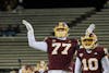 Central Michigan University redshirt freshman offensive lineman Jacob Saurbeck poses after the team sacks Buffalo's ball carrier at Kelly/Shorts Stadium on Wednesday, Nov. 12, 2025. Saurbeck helps keep the team hype throughout the game. (CM Life | Jasmine Brookins)
