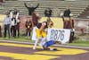The Central Michigan University cheer team runs down the end zone with flags spelling out 'Chippewas' after a touchdown at Kelly/Shorts Stadium on Wednesday, Nov. 12, 2025. To stay warm, the cheer team transitioned to sweatsuits. (CM Life | Jasmine Brookins)