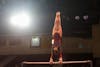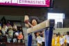 Central Michigan University junior Gabrielle Johnson hits 180 degrees while casting to a handstand at McGuirk Arena on Sunday, Jan. 18, 2026. Johnson scored a 9.2 on bars and a 9.5 on beam. (CM-Life | Jasmine Brookins)