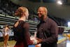 Central Michigan University junior Gabrielle Johnson has a chat with coach George Young before she competes bars at McGuirk Arena on Sunday, Jan. 18, 2026. (CM-Life | Jasmine Brookins)