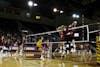 Central Michigan senior outside hitter Natalia Rejment spikes the ball over the net against Miami (OH) at McGuirk Arena, Friday, Nov. 7, 2025. Rejment had 10 kills for the Chippewas. (CM-Life | Mary Nowosacki)