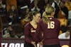 Central Michigan freshman outside hitter Taylor Cripe, left, and sophomore middle blocker Grace Thomas, right, high-five after winning a point against Miami Ohio at McGuirk Arena, Friday, Nov. 7, 2025. (CM-Life | Mary Nowosacki)