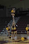 The Central Michigan cheerleading squad performs a stunt during a timeout at McGuirk Arena, Friday, Nov. 7, 2025. The cheerleaders attend most home games to cheer on and support the volleyball team. (CM-Life | Mary Nowosacki)