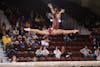 Central Michigan University junior Gabrielle Johnson does a gainer pike dismount from the beam at the gymnastics meet against Ball State University in McGuirk Arena on Friday, March 13, 2026. Johnson scored a 9.75 on bars and 9.775 on beam. (CM-Life | Jasmine Brookins)