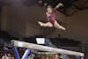 Central Michigan Unviersity sophomore Zoë Zimmerman does a leap on beam during the third rotation at the gymnastics meet against Ball State University in McGuirk Arena on Friday, March 13, 2026. Zimmerman scored a 9.7 on beam and a 9.875 on floor. (CM-Life | Jasmine Brookins)