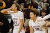 Central Michigan University senior guard Taylor Anderson (left) and sophomore guard Jayda Mosley (right) celebrate sophomore guard Madi Morson scoring a 3-pointer during the basketball game against Marshall University at McGuirk Arena on Saturday, Feb. 7, 2026. Morson scored 27 points with five rebounds and two assists. (CM-Life | Jasmine Brookins)