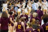 Central Michigan University senior forward Demetria Prewitt, sophomore forward Riley Smith, and freshman guard Rylan Buschell help sophomore guard Madi Morson off the ground at McGuirk Arena on Saturday, Nov. 22, 2025. Morson was fouled while scoring a layup, giving her the opportunity to shoot two free throws. (CM Life | Jasmine Brookins)