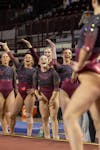 The Central Michigan gymnastics team celebrates during the floor routine by senior Quinn Skrupa at McGuirk Arena, on Friday, Feb. 14, 2025. Skrupa was the first Central Michigan gymnast to perform on the floor and scored 9.800. (CM-Life | Mark Hoover)
