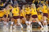 The Central Michigan University volleyball team celebrates winning the third and final set against Akron 29-27 at McGuirk Arena, on Friday, Oct. 17, 2025. The team will host Akron again on Saturday, Oct. 18, 2025 for Breast Cancer Awareness. (CM-Life | Jasmine Brookins)
