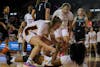 Central Michigan University senior guard Taylor Anderson and freshman guard Lilah Turnbull help sophomore forward Ayanna-Sarai Darrington off the ground at McGuirk Arena on Saturday, Jan. 17, 2026. Anderson scored a total of six points against Eastern with 10 rebounds. (CM-Life | Jasmine Brookins)