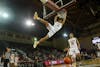 Central Michigan University sophomore forward Keenan Garner hangs from the rim as he dunks the ball during a basketball game against Eastern Michigan University at McGuirk Arena, Tuesday, Jan. 27, 2026. Garner scored a total of 12 points, with nine rebounds and five assists. (CM-Life | Jasmine Brookins)