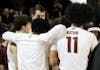 Central Michigan University freshman guard Uchenna Amene leans on junior forward Kayden Nation and sophomore guard Jaxson Whitaker while a play is under review at McGuirk Arena on Tuesday, Jan. 20, 2026. The verdict of the review ended the game with a 68-67 score. (CM-Life | Jasmine Brookins)