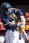 Central Michigan University sophomore infielder and outfielder Nathan Ball swings hard, giving him time to run to first base at Theunissen Stadium on Monday April 14, 2025. Ball was up to bat four times, scoring two runs and three hits. (CM Life | Jasmine Brookins)