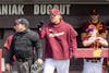 Central Michigan University sophomore infielder Bryson Webb and freshman infielder and pitcher Cayden Smith celebrate Smith's home run at Theunissen Stadium on Monday April 14, 2025. Smith was up to bat four times, scoring three runs. (CM Life | Jasmine Brookins)