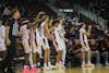 The Central Michigan University men's basketball bench celebrates freshman guard Jalen Kampens three point shot during a basketball game against Eastern Michigan University at McGuirk Arena, Tuesday, Jan. 27, 2026. Kampen scored a total of 11 points with one rebound. (CM-Life | Jasmine Brookins)